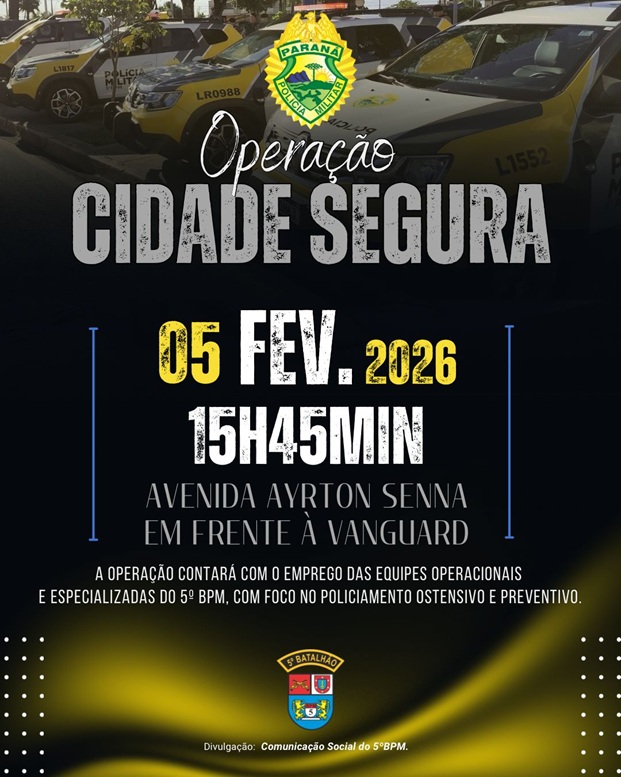 A Polícia Militar do Paraná, por meio do 5º Batalhão de Polícia Militar (5º BPM), lança na tarde desta quinta-feira (5) a Operação Cidade Segura 2026, com o objetivo de intensificar o policiamento ostensivo e ampliar a sensação de segurança da população em Londrina, no norte do Estado. A concentração da tropa está marcada para as 15h45, na Avenida Ayrton Senna, em frente à empresa Vanguard. A saída operacional está prevista para as 16h00, dando início às ações estratégicas em diversos pontos da cidade.