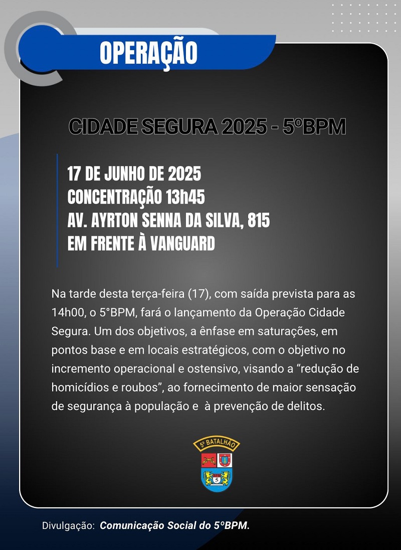 A operação tem como foco o reforço do policiamento ostensivo, com ênfase em ações de saturação, presença em pontos-base e patrulhamento em locais estratégicos da cidade. O objetivo principal é reduzir os índices de homicídios e roubos, além de aumentar a sensação de segurança da população e prevenir a ocorrência de delitos. Segundo o 5º BPM, a atuação será intensificada em áreas com maior incidência criminal, com abordagens e fiscalizações que devem impactar diretamente na ordem pública e na proteção dos cidadãos.