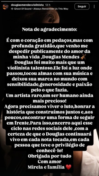 Sua esposa, Mirela, comunicou o falecimento pelas redes sociais em uma nota emocionante: “É com o coração em pedaços, mas com profunda gratidão, que venho me despedir publicamente do amor da minha vida.” Ela também encerrou o perfil de Douglas com a frase: “Ele seguirá vivo em cada nota tocada.”