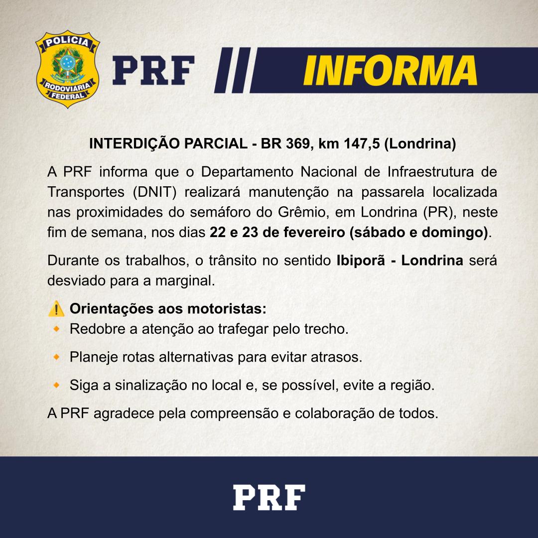 O Departamento Nacional de Infraestrutura de Transportes (DNIT) informou que o trânsito na BR-369, em Londrina, será parcialmente interditado a partir da manhã deste sábado (22). O bloqueio ocorrerá no Km 147,5, no sentido Ibiporã-Londrina, para manutenção emergencial da passarela perto do Grêmio Londrinense.