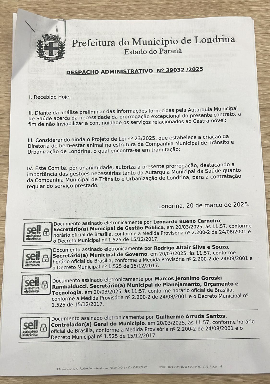 Na tarde desta quinta-feira (20), o prefeito de Londrina, Tiago Amaral, assinou o contrato que garante a continuidade do serviço do Programa Municipal de Controle Populacional de Cães e Gatos, o Castramóvel, sob a responsabilidade da Secretaria de Saúde. Com isso, o atendimento não sofrerá interrupções e seguirá funcionando normalmente.