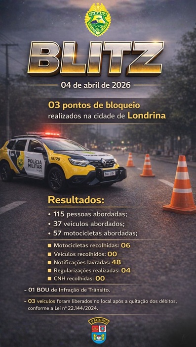 Uma operação de fiscalização de trânsito realizada no último sábado (4) mobilizou equipes policiais em diferentes pontos da cidade, resultando em mais de uma centena de abordagens e dezenas de autuações, em Londrina Os bloqueios foram montados estrategicamente na Avenida Alziro Zarur, Avenida Vinícius de Moraes e Rua Pernambuco, locais definidos pelas autoridades com base em critérios operacionais e de segurança viária. Durante a ação, 115 pessoas foram abordadas, além da fiscalização de 37 veículos e 57 motocicletas. Como resultado, seis motocicletas foram recolhidas por irregularidades, enquanto nenhum veículo de passeio precisou ser removido. A operação também contabilizou 48 notificações de trânsito lavradas e quatro regularizações realizadas no local. Não houve recolhimento de Carteiras Nacionais de Habilitação (CNH). Um Boletim de Ocorrência Unificado (BOU) por infração de trânsito foi registrado ao longo da blitz.