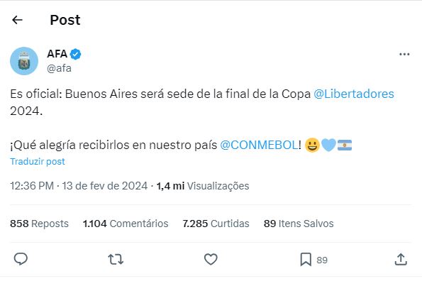 A cidade de Buenos Aires, na Argentina, será a sede da final da edição 2024 da Copa Libertadores da América, anunciou a AFA (Federação Argentina de Futebol), nesta terça-feira (13), por meio de suas contas em redes sociais. “É oficial: Buenos Aires será sede da final da Copa Libertadores 2024. Que alegria os receber em nosso país Conmebol”, declarou a AFA na rede X (antigo Twitter).