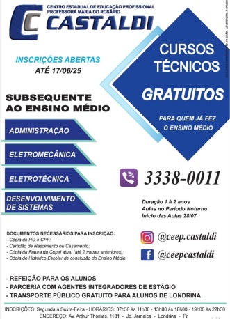 O Centro de Educação Profissional Professora Maria do Rosário Castaldi, em Londrina, está com matrículas abertas para cursos técnicos gratuitos no período noturno, com início das aulas previsto para o dia 28 de julho, no segundo semestre letivo de 2025. Ao todo, estão sendo ofertados cinco cursos técnicos para quem já concluiu o ensino médio: Administração, Eletromecânica, Eletrônica, Eletrotécnica e Desenvolvimento de Sistemas. As aulas acontecem de segunda a sexta-feira, das 19h às 22h40, e são 100% gratuitas.