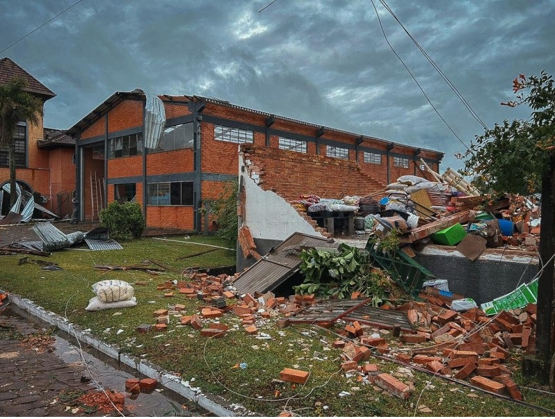 Igreja centenária, ginásio esportivo e estruturas rurais foram danificadas; outros 11 municípios do RS também registraram impactos