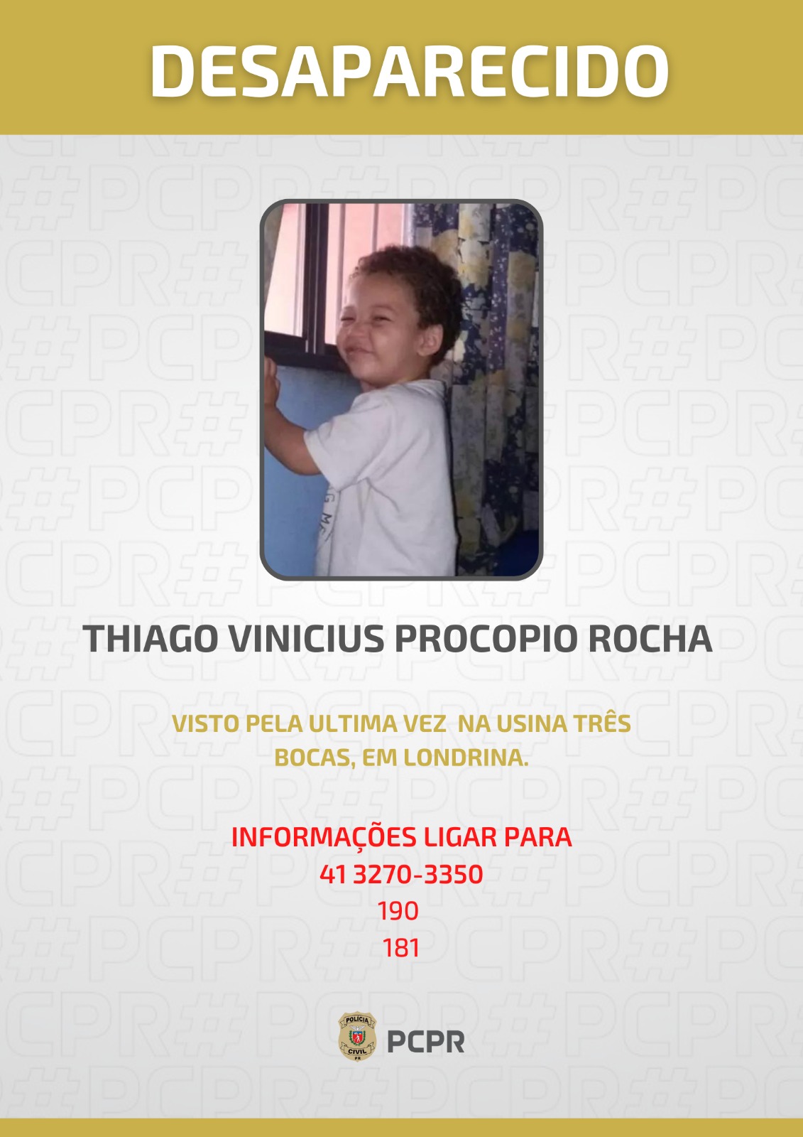 A Polícia Civil do Paraná, por meio do Sicride, Serviço de Investigação de Crianças Desaparecidas, divulgou, nesta terça-feira (13), um cartaz de desaparecido com a foto do menino