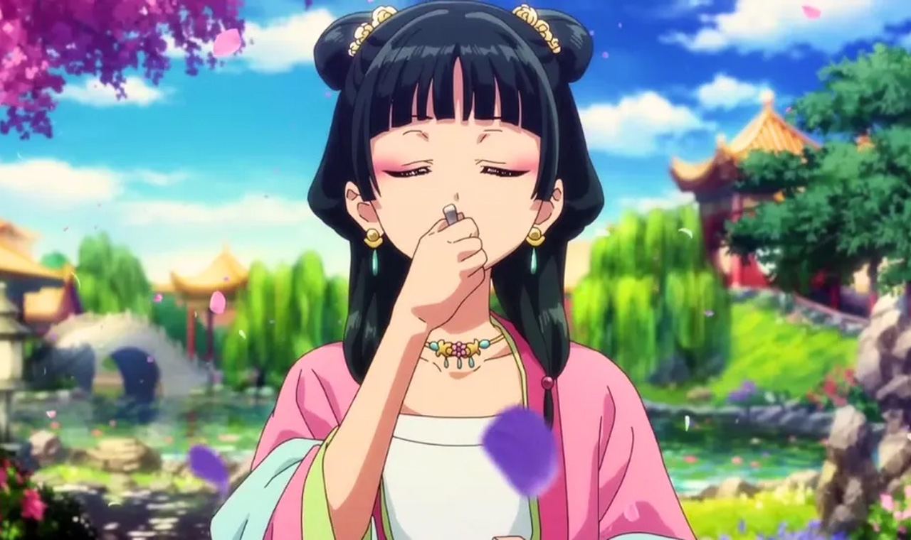 o anime ambientado na china imperial acompanha maomao, que era uma apotecária vivendo no distrito da luz vermelha, até que foi sequestrada para trabalhar como serviçal no palácio das concubinas do imperador. Ela tenta esconder seus conhecimentos medicinais e passar despercebida. mas isso não dura muito tempo já que ela chama atenção do eunuco-chefe jinshi ao salvar a vida de um bebê, e foi ai que seu segredo foi descoberto.