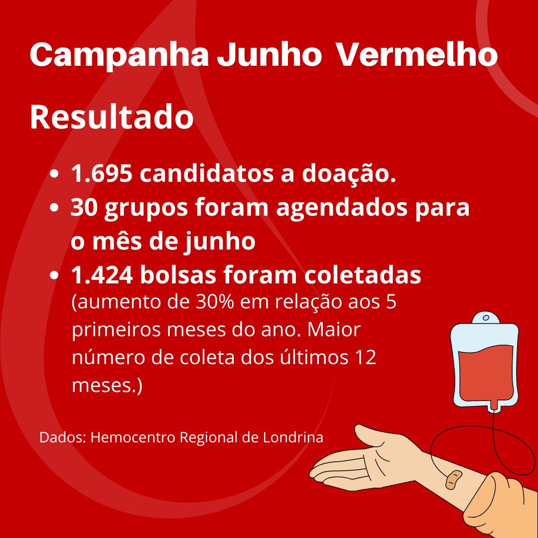 O Hemocentro do Hospital Universitário (H.U.) de Londrina divulgou nesta segunda-feira o resultado da Campanha Junho Vermelho desse ano. Foram 1695 doadores no mês e 30 grupos foram agendados para Junho. Durante a campanha 1424 bolsas foram coletadas, representando um aumento de 30% em relação aos cinco primeiros meses do ano e o maior número de coleta dos últimos 12 meses.