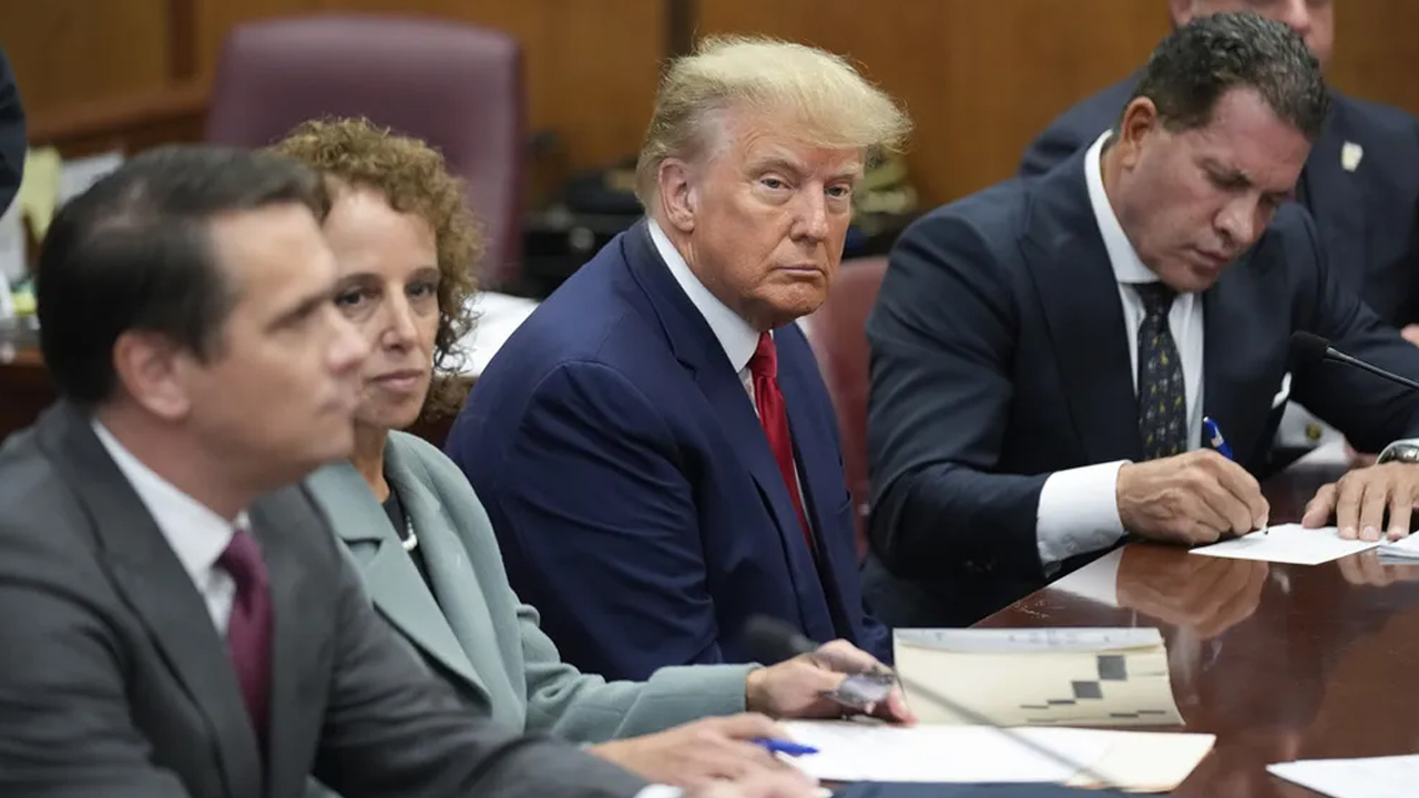 O ex-presidente Donald Trump senta-se à mesa da defesa com sua equipe no Tribunal Criminal de Manhattan, Nova York, EUA, em 4 de abril de 2023 | © AP Photo/Seth Wenig