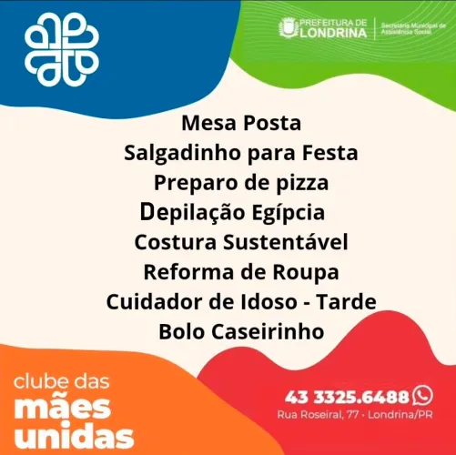 O Clube das Mães Unidas está com inscrições abertas para turmas de oito cursos profissionalizantes gratuitos oferecidos pela organização da sociedade civil (OSC), via Termo de Colaboração firmado com a Prefeitura de Londrina, por meio da Secretaria Municipal de Assistência Social (SMAS).