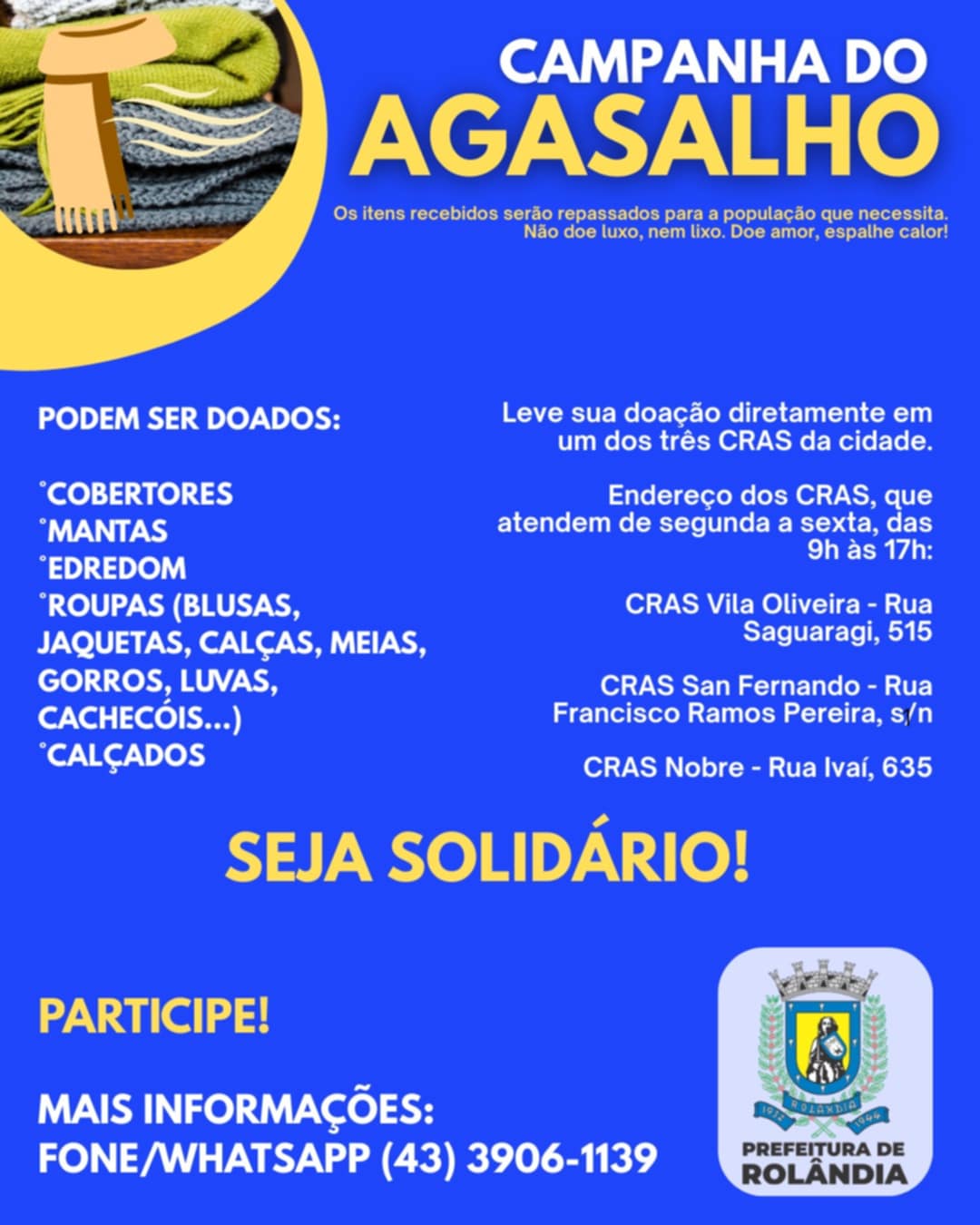 Com a chegada das temperaturas mais baixas, a Secretaria de Assistência Social de Rolândia deu início à “Campanha do Agasalho 2025”, uma ação solidária que tem como objetivo arrecadar roupas e cobertores para aquecer o inverno de quem mais precisa. A campanha reforça o apelo por doações conscientes, com o lema: “Não doe luxo, nem lixo. Doe amor, espalhe calor!”. Todos os itens arrecadados serão destinados diretamente à população em situação de vulnerabilidade social. A entrega das doações pode ser feita em um dos três CRAS (Centros de Referência de Assistência Social) da cidade, que funcionam de segunda a sexta-feira, das 9h às 17h: