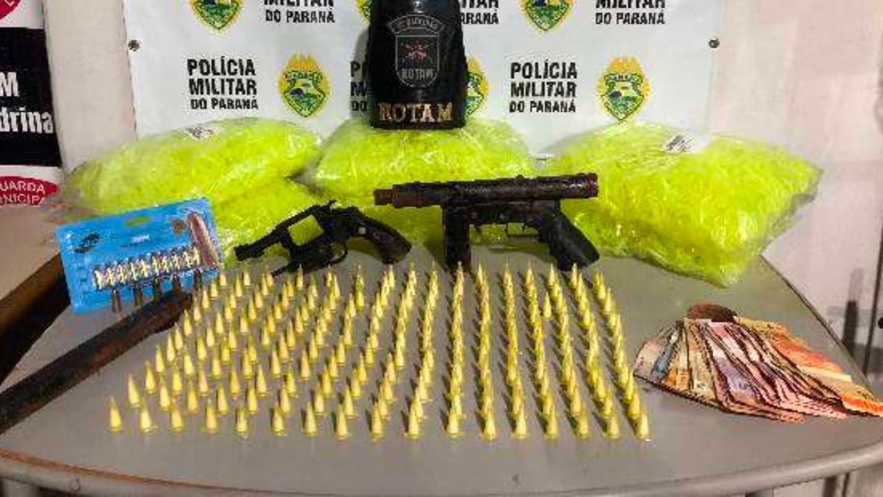 Os policiais da Rotam de Londrina prenderam, na noite de quarta-feira (19), um homem com duas armas e drogas na rua Novarino Geraldo da Silva, no Jardim Paris na zona norte de Londrina, no norte do Paraná. Uma das armas era uma metralhadora de fabricação caseira e a outra, um revólver calibre 38.