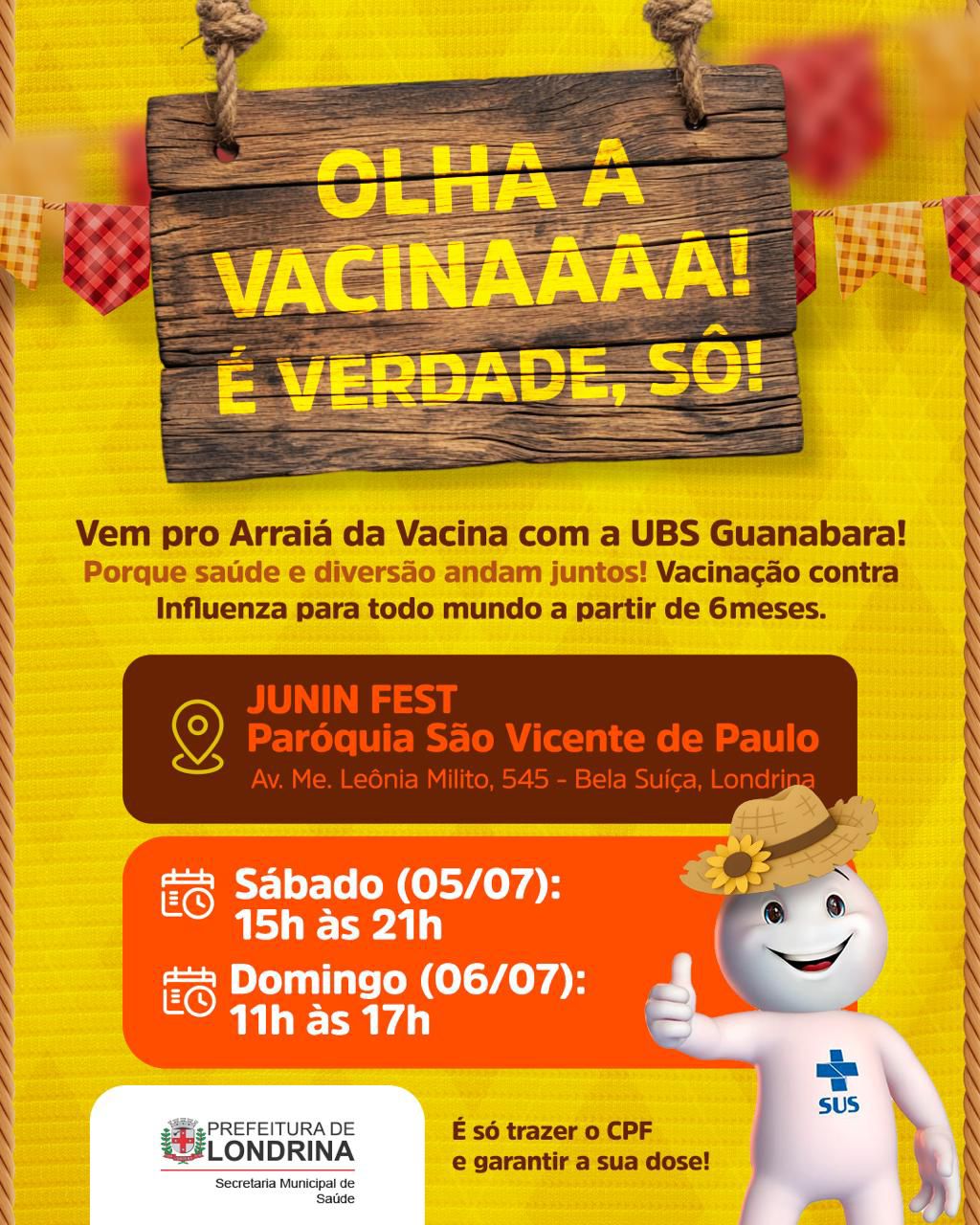 A tradicional Junin Fest 2025, realizada pela Paróquia São Vicente de Paulo em Londrina, contará com uma ação especial de vacinação contra a gripe neste fim de semana. A atividade será promovida pela Secretaria Municipal de Saúde (SMS), por meio da UBS Guanabara, nos dias sábado (5) e domingo (6), com estande montado no evento para imunizar o público contra o vírus Influenza.