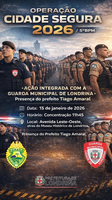 Londrina lançou, no fim da manhã desta quinta-feira (15), a primeira edição de 2026 da Operação Cidade Segura. A ação ocorreu na avenida Leste Oeste e reúne esforços da Polícia Militar e da Guarda Municipal, com foco no reforço da segurança e na intensificação do policiamento nas ruas da cidade. A operação prevê a atuação integrada das forças de segurança, com grande número de policiais, guardas municipais e viaturas, que irão realizar fiscalizações e ações preventivas e repressivas contra a criminalidade em diferentes regiões do município.