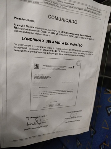 A linha de transporte intermunicipal entre Londrina e Bela Vista do Paraíso terá suas operações encerradas em 1º de maio de 2026. A medida foi oficializada após notificação do Departamento de Estradas de Rodagem do Paraná (DER-PR), por meio do Ofício nº 0825-26, que estabelece o cronograma para a descontinuidade do serviço. A operação é realizada pela Viação Garcia, que informou ter decidido pelo encerramento com base em critérios técnicos e econômicos. Segundo a empresa, a manutenção da linha se tornou financeiramente inviável diante do aumento dos custos operacionais, especialmente combustível e manutenção, somado à redução no número de passageiros ao longo dos anos.