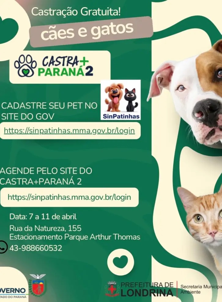A Prefeitura de Londrina, por meio da Secretaria Municipal do Ambiente (Sema), vai realizar uma ação gratuita de castração de cães e gatos pelo programa Castra+Paraná 2. Ao todo, são mil vagas disponíveis, com atendimentos programados entre os dias 7 e 11 de abril, no estacionamento do Parque Municipal Arthur Thomas.