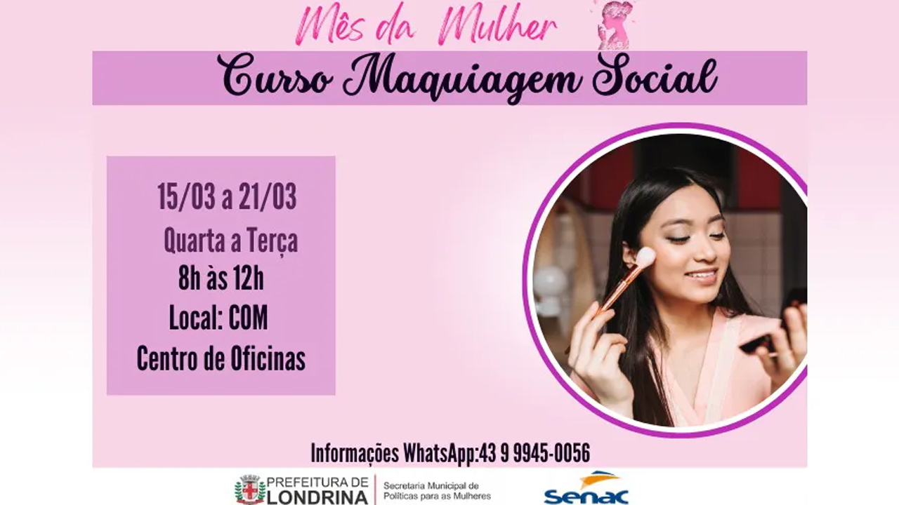 A oficina de Maquiagem Social, com 15 vagas disponíveis, será realizada no Centro de Oficinas para Mulheres (COM), localizado na Rua Valparaíso, 189 (Parque Guanabara), de quarta-feira (15) até o dia 21 de março, das 8h às 12h. A instrutora Janaína de Lima abordará todos os tipos de maquiagem aplicados e projetados para ocasiões especiais ou eventos. A atividade é voltada para mulheres a partir de 18 anos e as interessadas podem se inscrever pelo número de WhatsApp (43) 99945-0056.