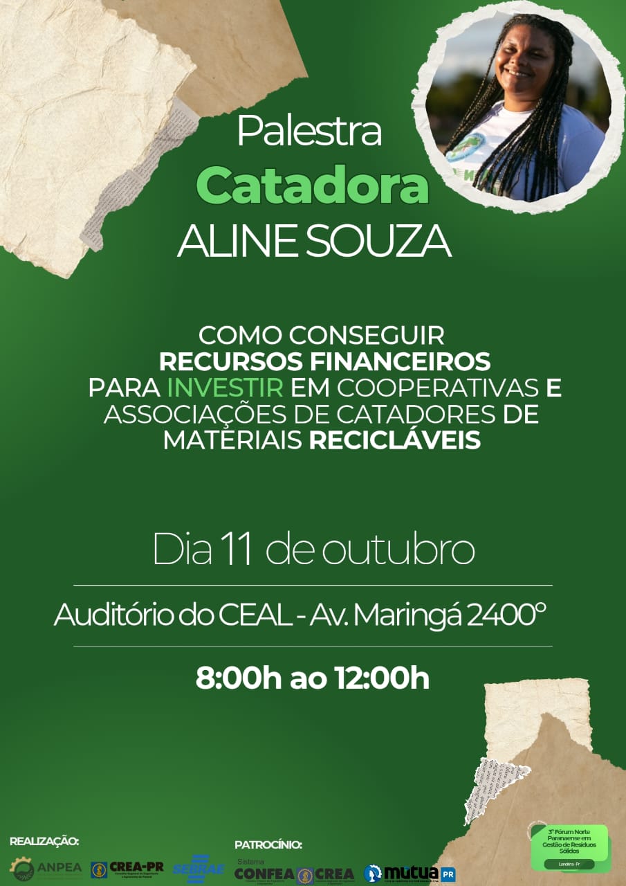 Com o tema “Fortalecer quem transforma o mundo com as próprias mãos”, Londrina sedia, neste sábado (11), uma palestra com Aline Souza, catadora de materiais recicláveis e referência nacional no setor, de Brasília (DF). O encontro será realizado no CEAL – Clube de Engenharia e Arquitetura de Londrina, das 8h ao meio-dia, e marca a primeira etapa do projeto “três em um”, que integra ações sociais, técnicas e de capacitação voltadas à gestão de resíduos sólidos e ao fortalecimento das cooperativas da região.