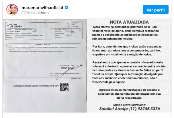 Em publicação acompanhada de um atestado médico, Mara relatou o momento delicado e pediu apoio. “Por hora, comunico que minha agenda de trabalho está suspensa. Preciso da sua oração e apoio”, escreveu. O documento médico informa que Eliemary Silva da Silveira, nome de registro da artista, está internada desde 1º de fevereiro de 2026, em acompanhamento contínuo na UTI.