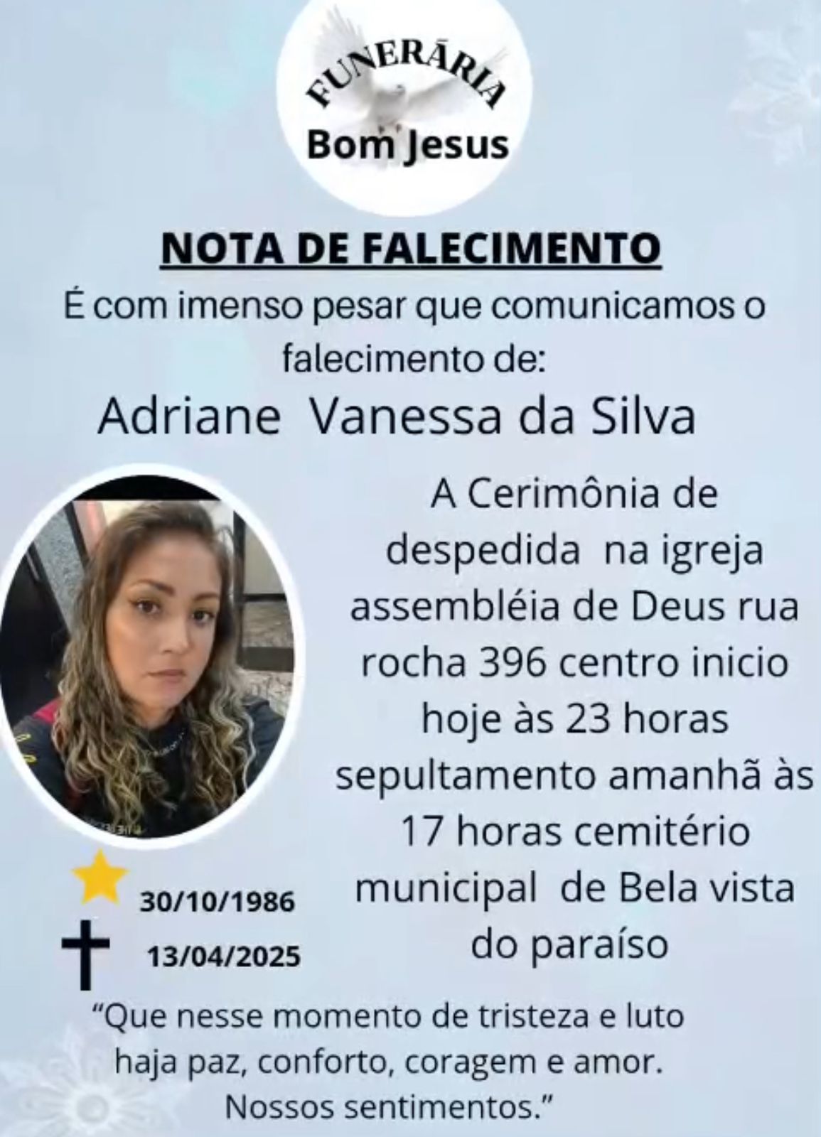 Adriane Vanessa será velada em uma igreja no Centro de Bela Vista do Paraíso, onde familiares e amigos se despedem com pesar da motociclista, lembrada por sua dedicação ao trabalho e pelo carinho com todos ao seu redor.