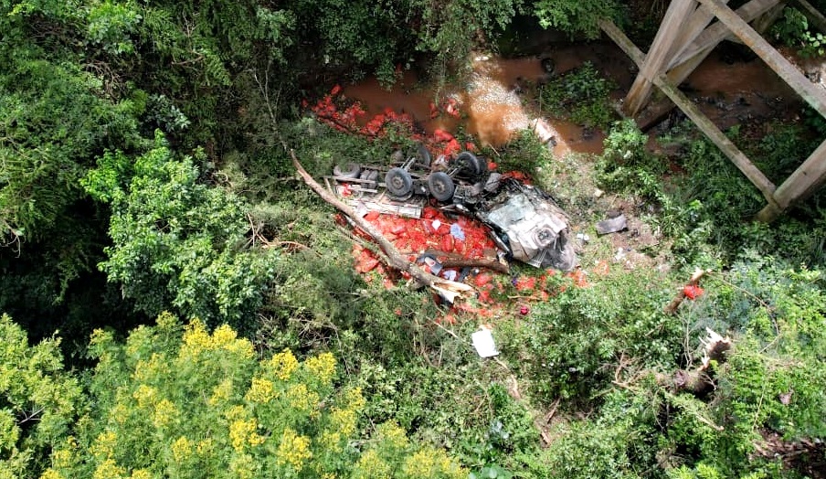 Carreta carregada de cebola bate em dois caminhões e despenca de ponte, no Norte do Paraná