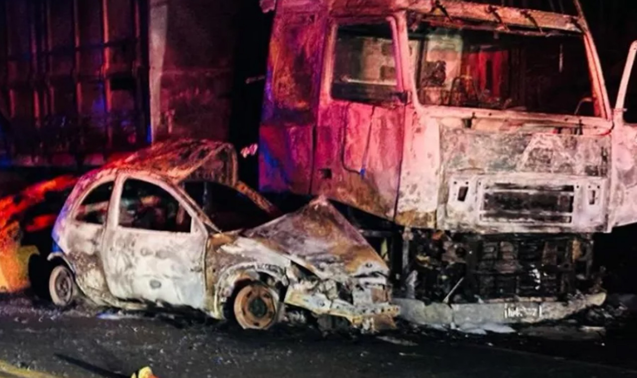Motorista morre carbonizado após acidente entre carreta e carro na BR-163 no Paraná