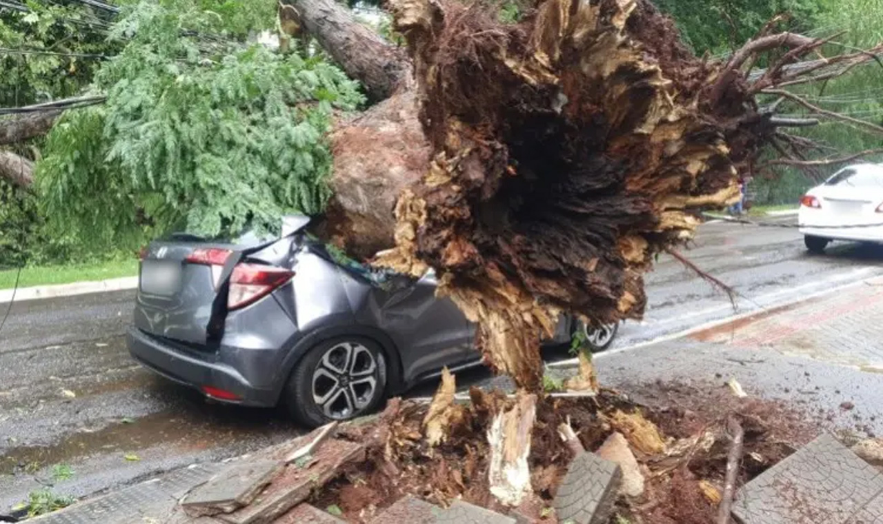 Ventos de 86 km/h derrubam árvore sobre carro e bloqueia avenida em Maringá