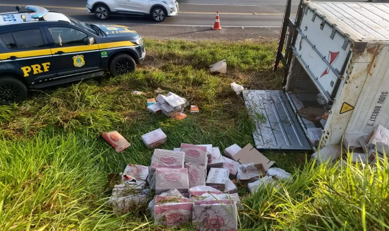Caminhão tomba e populares saqueiam carga de frango na BR 376, no Norte do Paraná