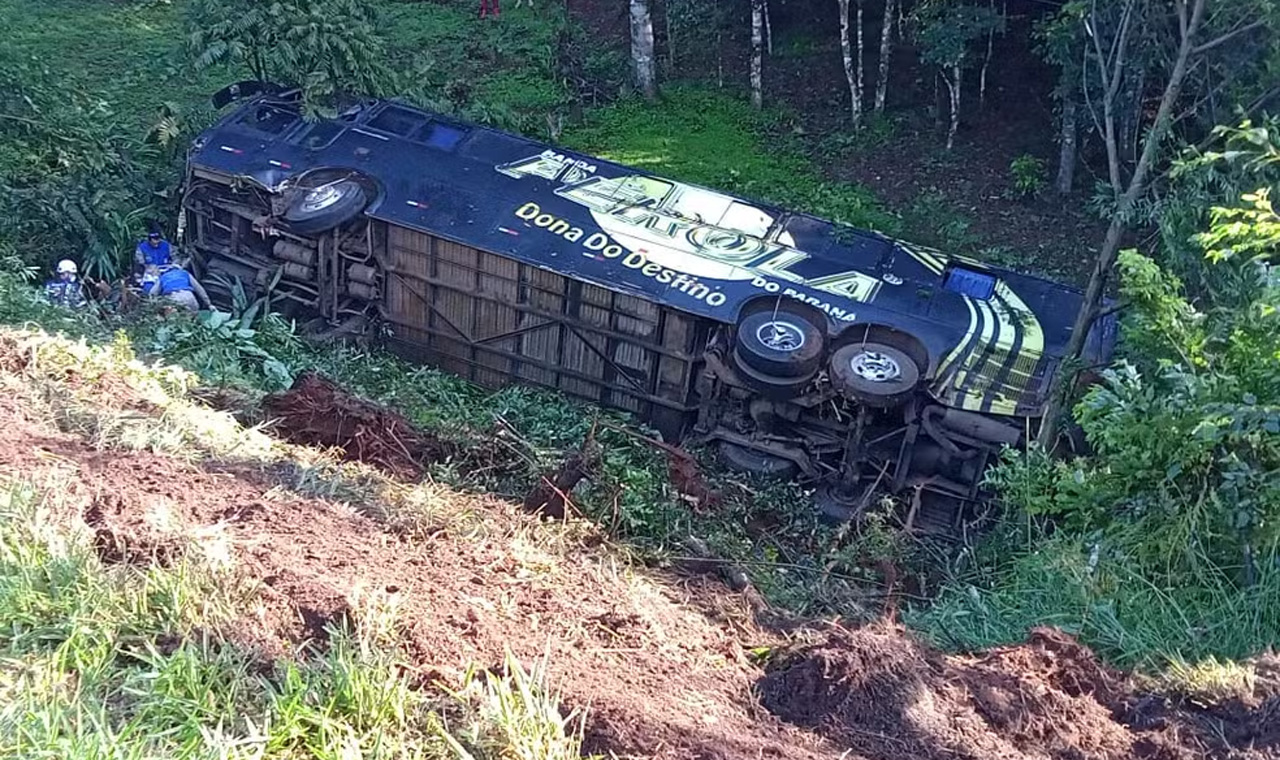 Ônibus da Banda Pérola cai em barranco de 8m e deixa feridos na PR-280, no Paraná