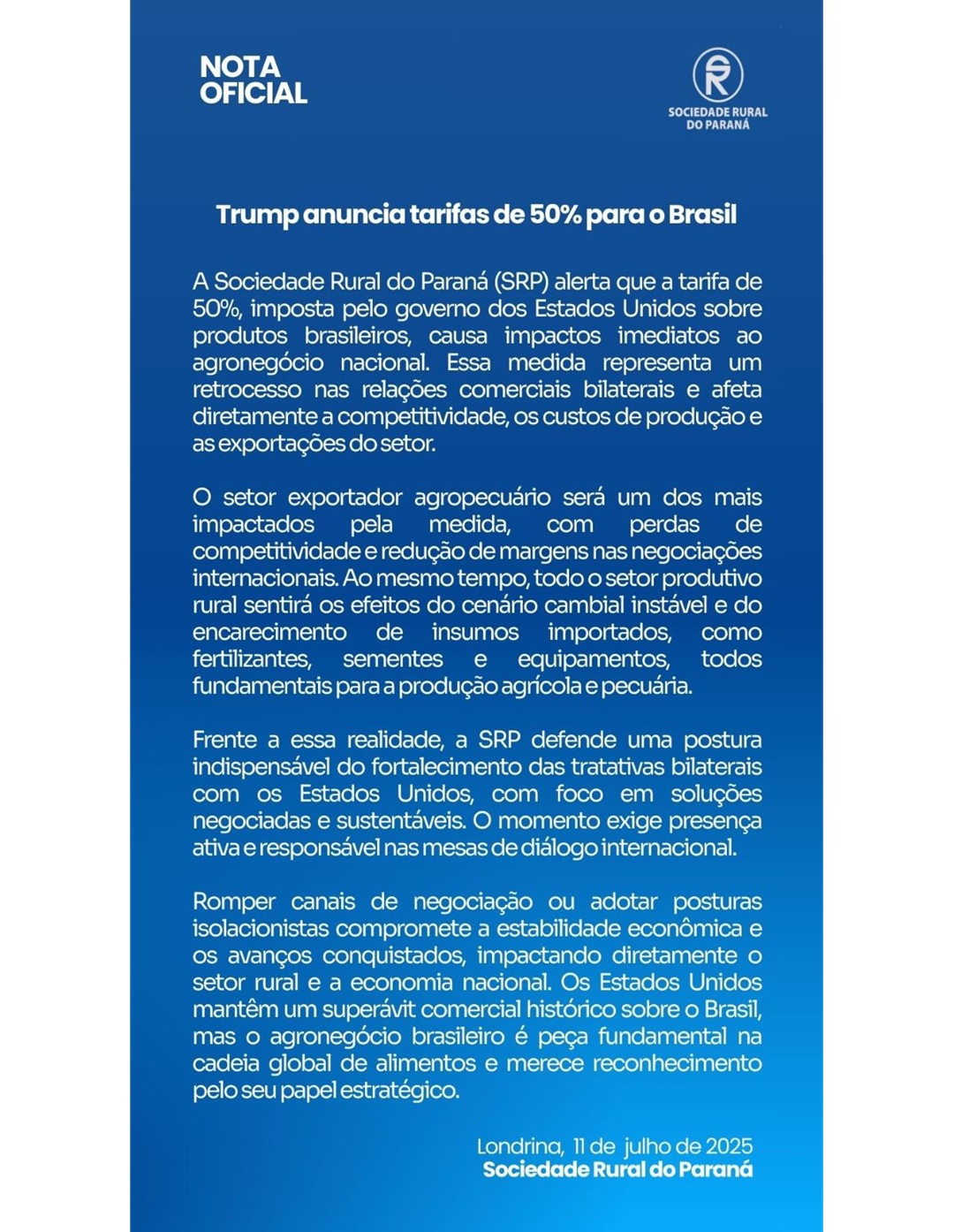 Tarifa dos EUA ameaça agronegócio brasileiro, alerta Sociedade Rural do Paraná