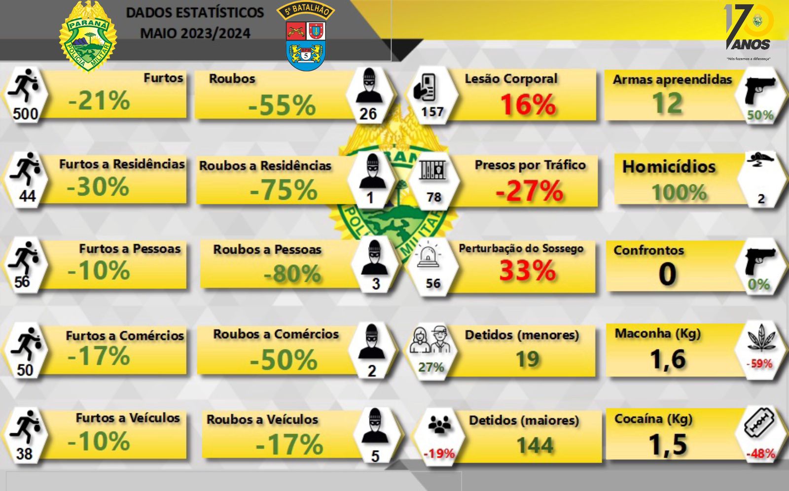 Maio registra o menor número de roubos da história do 5º Batalhão da PM