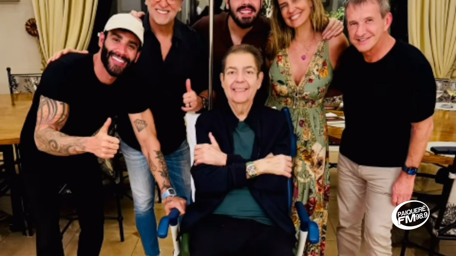 Faustão aparece em foto rara ao lado de Gusttavo Lima, esposa, filho e amigos