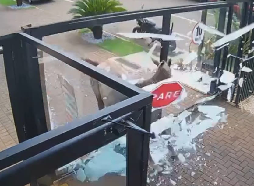 Cavalo quebra vidro de portão de condomínio em Londrina; prejuízo estimado em R$ 10 mil