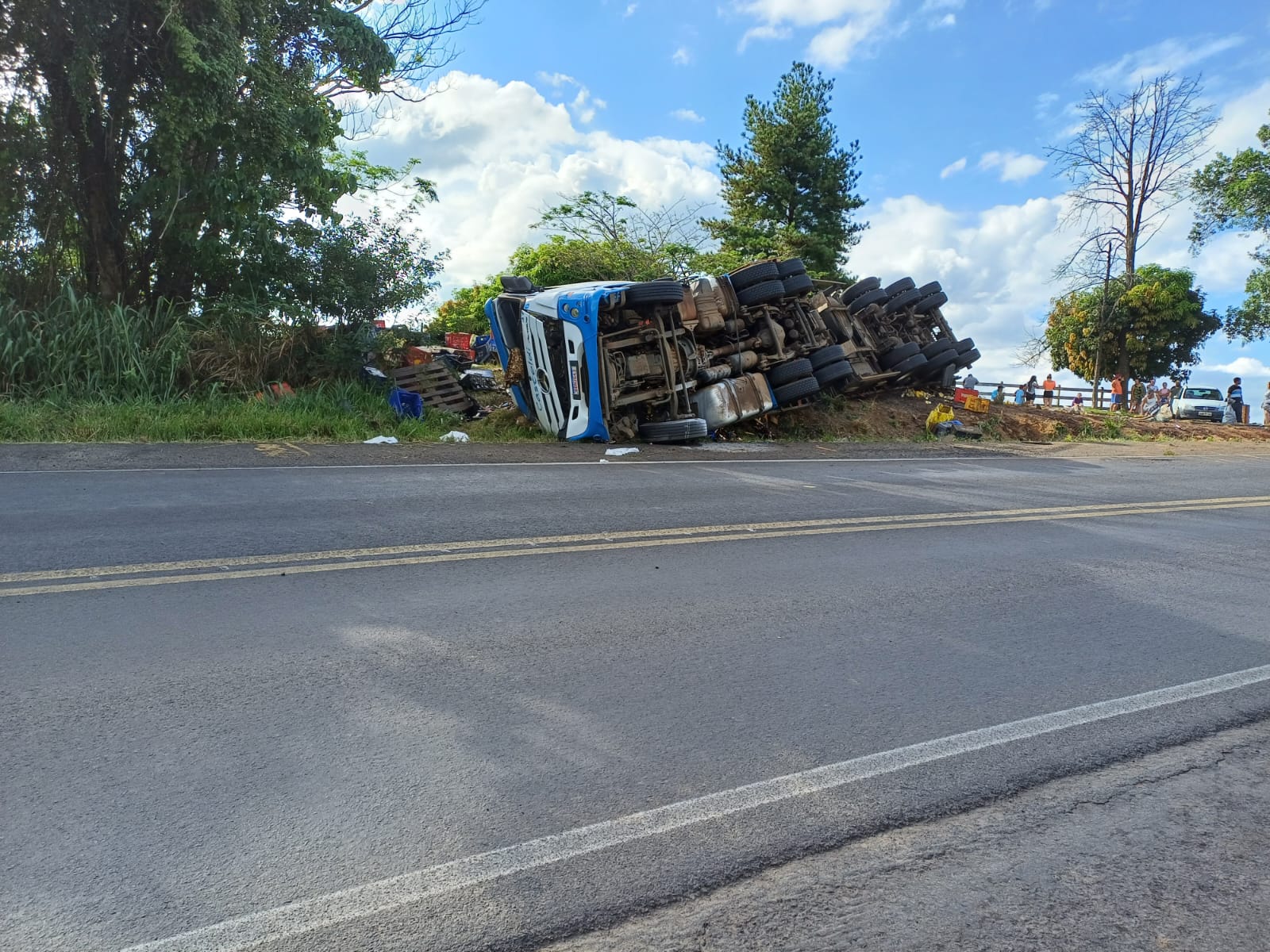 Carreta carregada com cerveja tomba na BR-153 em Ibaiti; carga é saqueada
