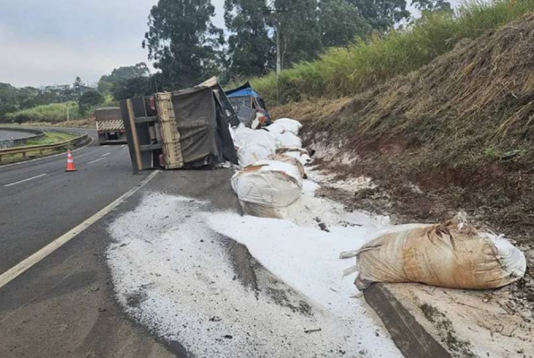Carreta carregada com ureia tomba no Contorno Sul de Apucarana