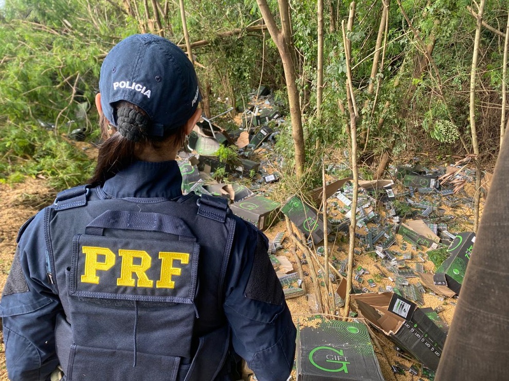 PRF apreende 200 mil maços de cigarros contrabandeados após tombamento de carreta em Terra Roxa