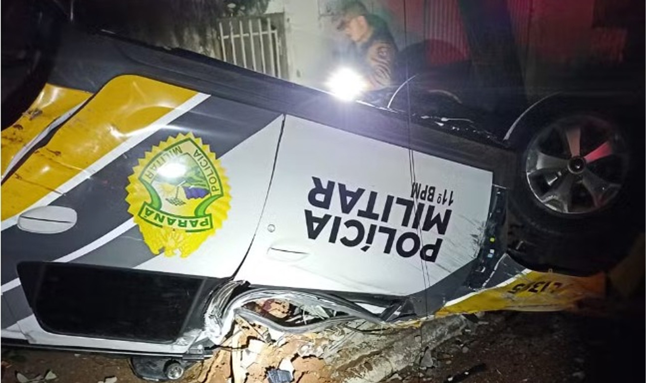 Policiais militares batem contra poste e capotam viatura durante perseguição no Paraná