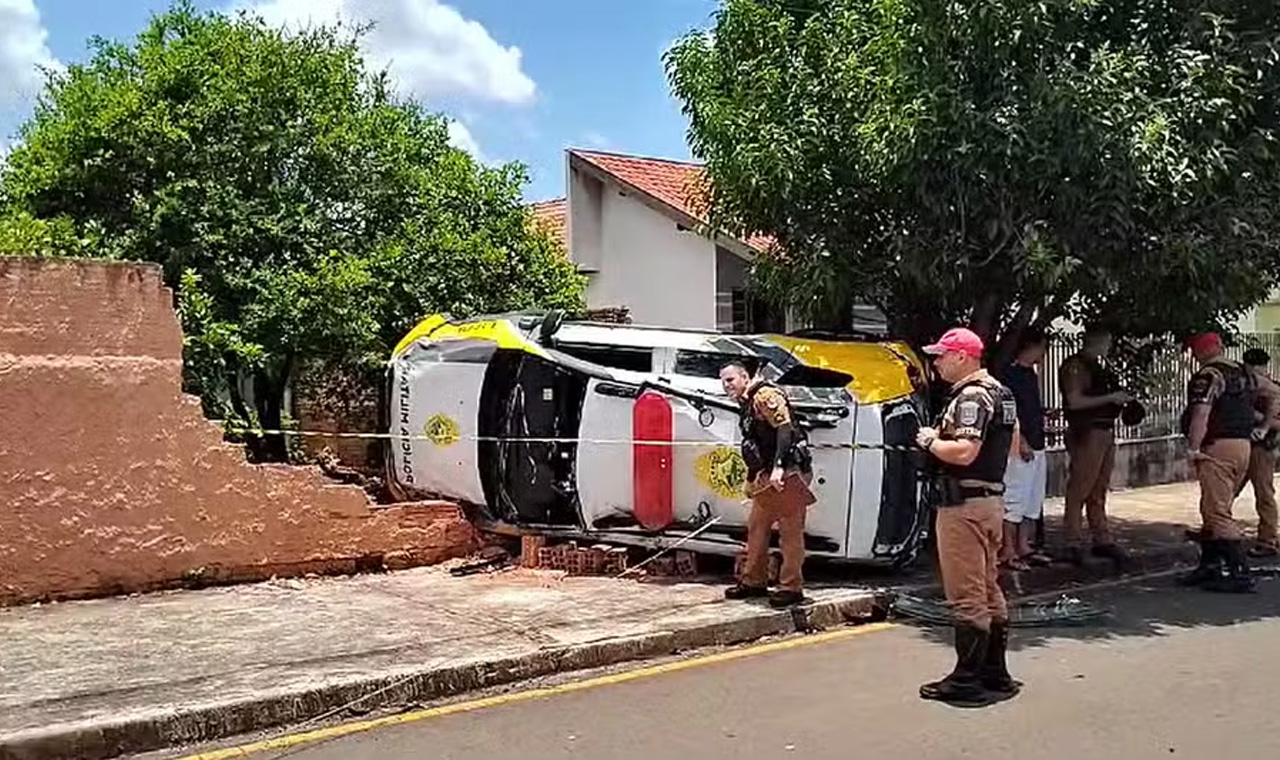 Viatura da PM bate em carro, capota, derruba muro e fere policiais na região de Londrina