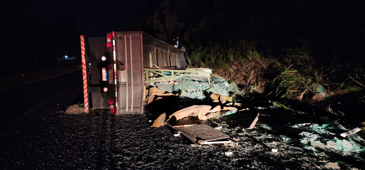 Caminhão carregado com espelhos tomba na BR-376 e motorista morre no local