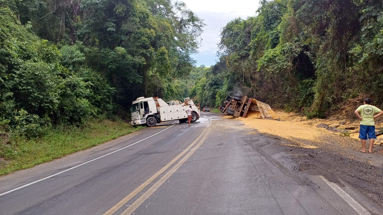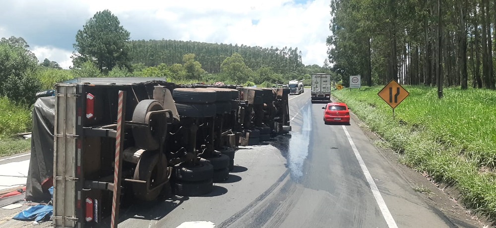 Caminhão tomba e pega fogo na BR-153 em Ibaiti