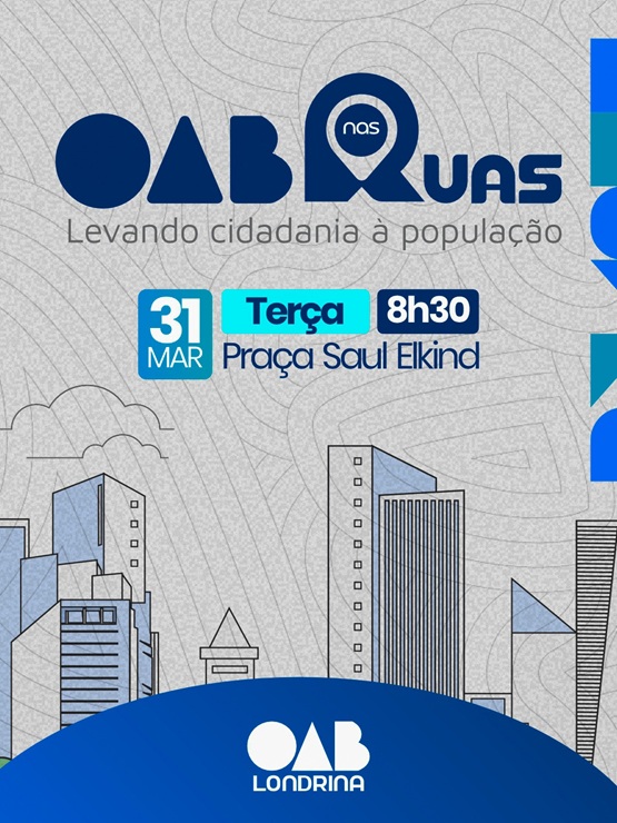 A OAB Londrina realizará, no dia 31 de março, a primeira edição de 2026 do projeto OAB nas Ruas, maior ação de cidadania organizada pela advocacia na cidade. O evento acontecerá das 8h30 às 12h na Praça Saul Elkind, na Zona Norte, região com cerca de 150 mil habitantes. Centenas de advogados e advogadas voluntários, de mais de 40 comissões temáticas da subseção, oferecerão orientação gratuita em áreas como direito do consumidor, previdenciário, trabalhista, bancário, saúde, direitos da pessoa idosa, da pessoa com deficiência, migrantes, entre outros. Segundo o presidente da OAB Londrina, Mário Xavier, a iniciativa tem caráter educativo e informativo, ajudando a população a conhecer seus direitos e caminhos para reivindicá-los, seja por meio do INSS, Procon, Juizados Especiais ou núcleos de prática jurídica gratuita.