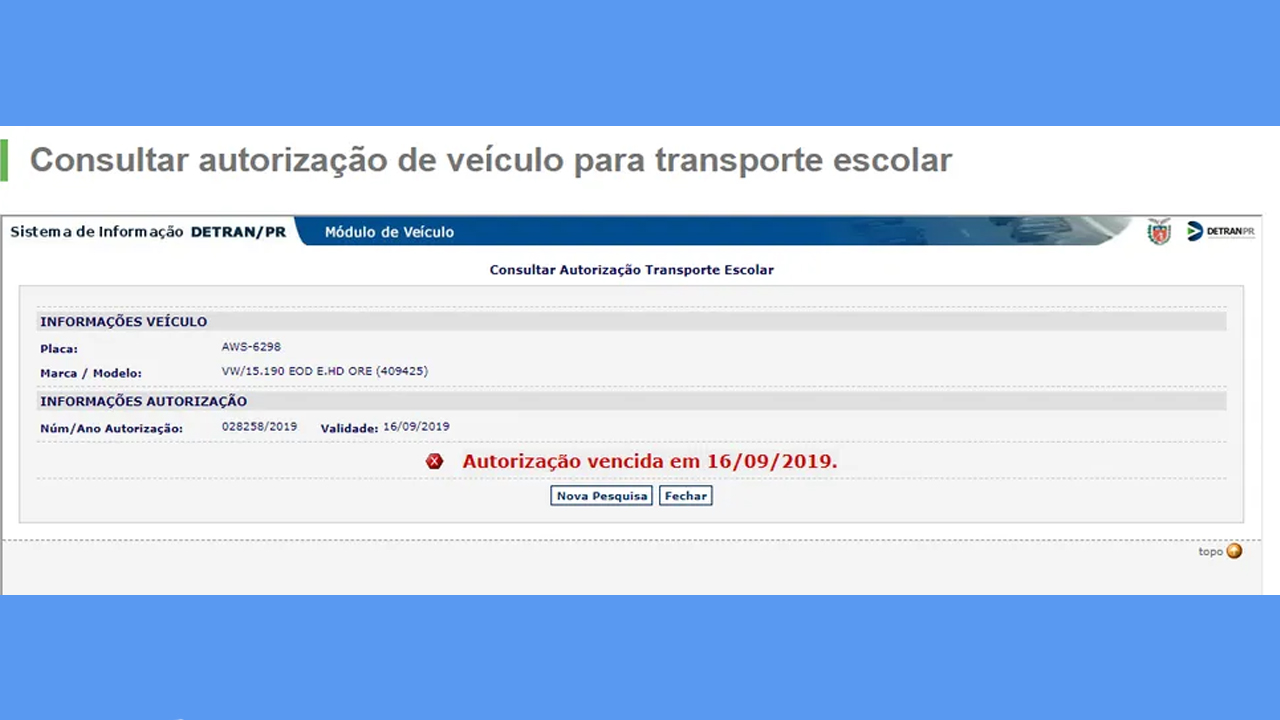 De acordo com informações do site do Departamento de Trânsito do Paraná, o ônibus com crianças da Associação de Pais e Amigos dos Excepcionais (Apae) que foi atingido por um trem em um cruzamento em Jandaia do Sul, no norte do Paraná, estava com a licença para transporte escolar vencida para circulação desde 16 setembro de 2019.