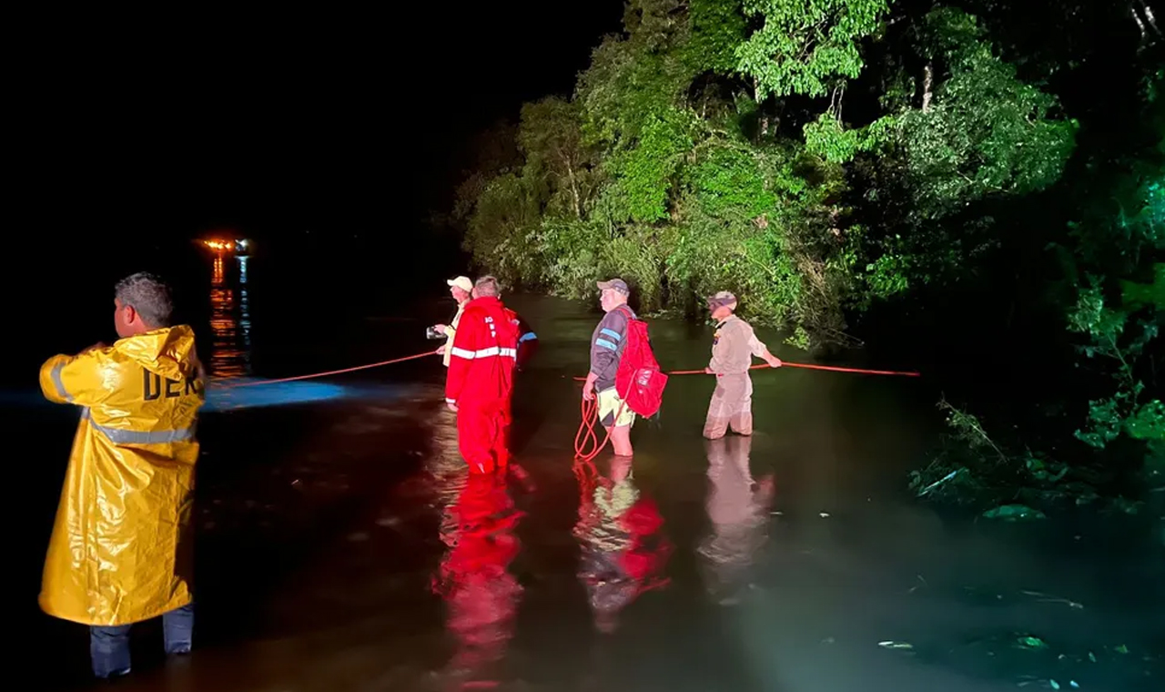 O Corpo de Bombeiros informou que pai e filho estão desaparecidos após uma família tentar atravessar uma estrada alagada e teve o carro arrastado para um rio no entorno do Rio Preto, no interior de Irati, na Região Central do Paraná, na noite de domingo (08).