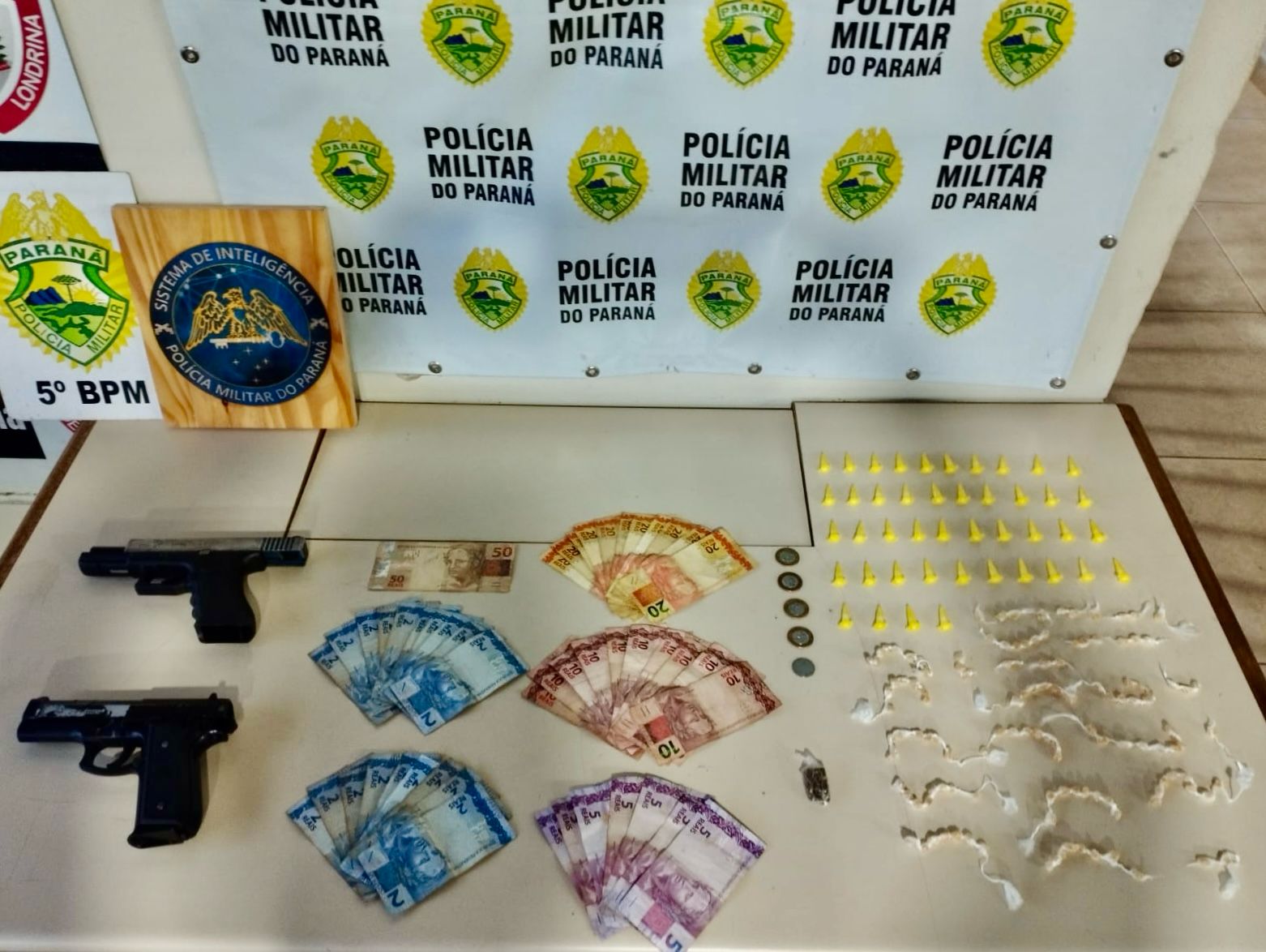 A Polícia Militar (PM) informou que prendeu um rapaz, de 19 anos, com dois simulacros de arma de fogo, 44 eppendorf de cocaína (37 gramas), 135 pedras de crack (28 gramas), uma porção de maconha (2 gramas) e R$ 447,00, no Conjunto Ernani Moura Lima, na zona leste de Londrina, na tarde de quinta-feira (25).