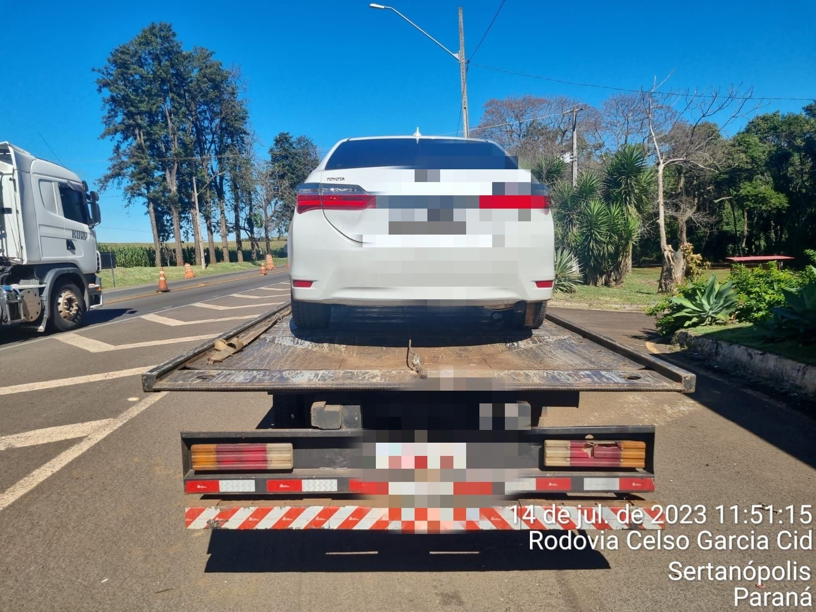 O motorista do guincho contou que teria pego o carro em Francisco Beltrão, Paraná, e iria entregar em Santa Cruz do Rio Pardo, em São Paulo