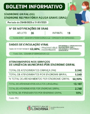 A Prefeitura de Londrina começou a divulgar um boletim semanal com informações sobre casos de Síndrome Respiratória Aguda Grave (SRAG) e Síndrome Gripal (SG). O material é publicado pela Secretaria Municipal de Saúde nos canais oficiais, como o Instagram @saudelondrinaoficial e o blog da Prefeitura. O primeiro boletim, que cobre o período de 25 a 31 de maio, registrou 45 casos de SRAG: 26 em adultos e 19 em crianças. Em 2025, já são 64 mortes por SRAG, sendo 11 por Covid-19, 10 por influenza, 2 por vírus sincicial respiratório (VSR) e outras causas. A maioria (37) ainda não teve a causa identificada.