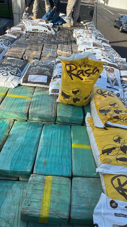 A Polícia Rodoviária Federal (PRF) apreendeu, na tarde desta terça-feira (17), uma grande quantidade de maconha durante uma fiscalização na BR-369, em Cambé. A apreensão aconteceu por volta das 14h e totalizou 6.787,13 kg da droga. Os policiais abordaram um caminhão com placas de São Paulo (SP). Durante a fiscalização, a equipe percebeu um forte odor característico de maconha vindo da carga. Ao determinarem o deslocamento do veículo para uma vistoria mais detalhada, os agentes retiraram uma camada de sacos de ração canina e encontraram diversos fardos e tabletes de maconha escondidos.