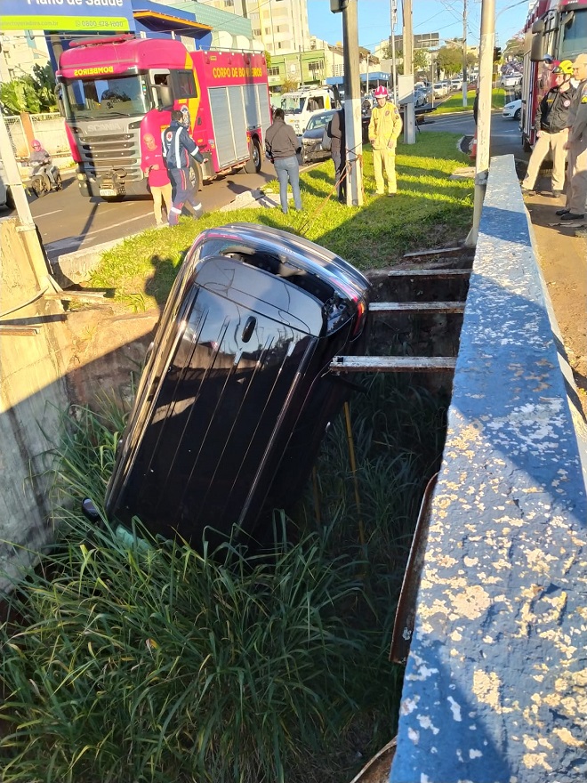 Na manhã desta sexta-feira (4), um carro ficou pendurado no viaduto da avenida Juscelino Kubitschek (JK), em Londrina, após um acidente envolvendo dois veículos. O Jeep Commander acabou preso por uma barra de ferro na estrutura lateral da ponte que liga a JK à avenida Dez de Dezembro, com a frente voltada para baixo, a cerca de 30 metros de altura.