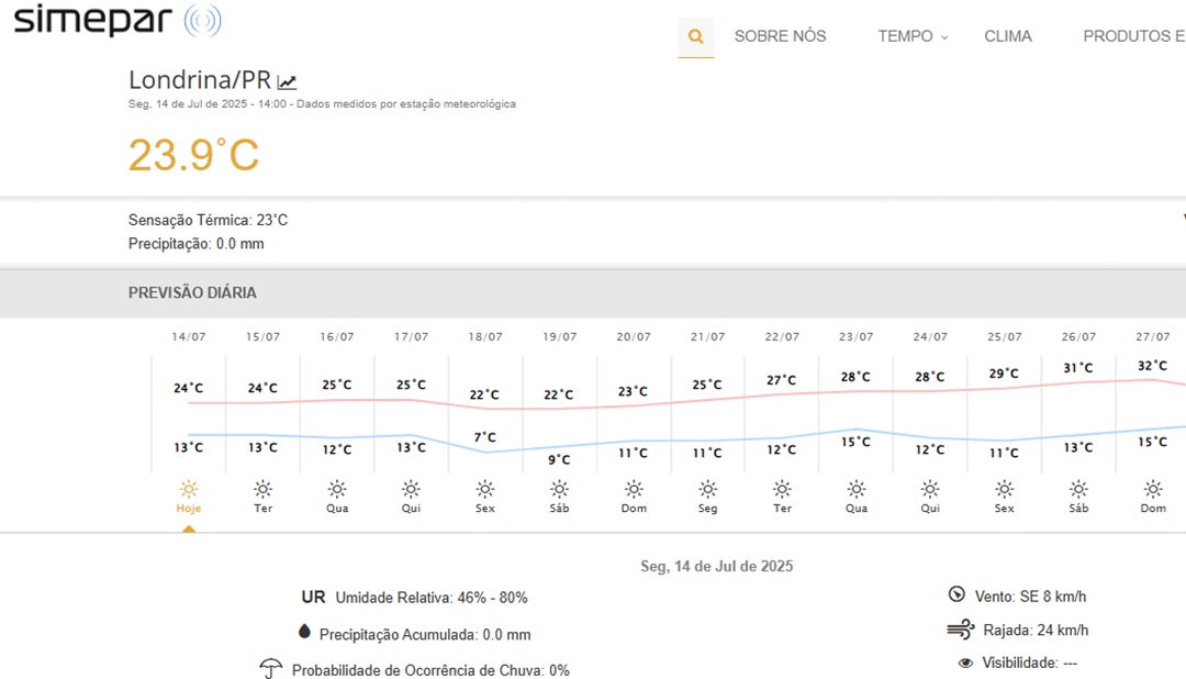 A semana entre os dias 14 e 18 de julho será marcada por mudanças no clima no Paraná. De acordo com o Simepar (Sistema de Tecnologia e Monitoramento Ambiental do Paraná), o início da semana será de sol em grande parte do estado, com temperaturas em declínio gradativo, especialmente nas regiões sul, Campos Gerais e Metropolitana de Curitiba.