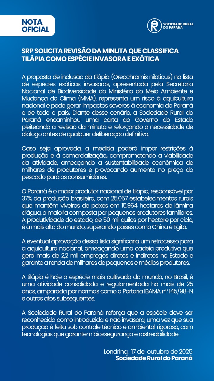 A Sociedade Rural do Paraná (SRP) encaminhou uma carta ao Governo do Estado manifestando preocupação com a proposta do Ministério do Meio Ambiente e Mudança do Clima (MMA) de incluir a tilápia (Oreochromis niloticus) na lista de espécies exóticas invasoras. Segundo a entidade, a medida, caso seja aprovada, representaria grave risco à aquicultura nacional, com impactos severos à economia do Paraná — estado líder na produção do peixe — e de todo o país.